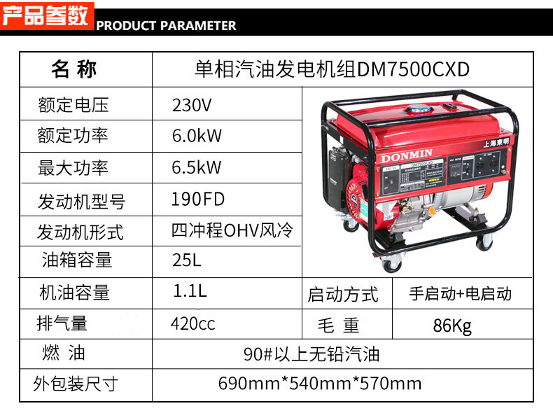 單相6千瓦汽油發(fā)電機(jī)組電啟動DM7500CXD【帶移動輪】