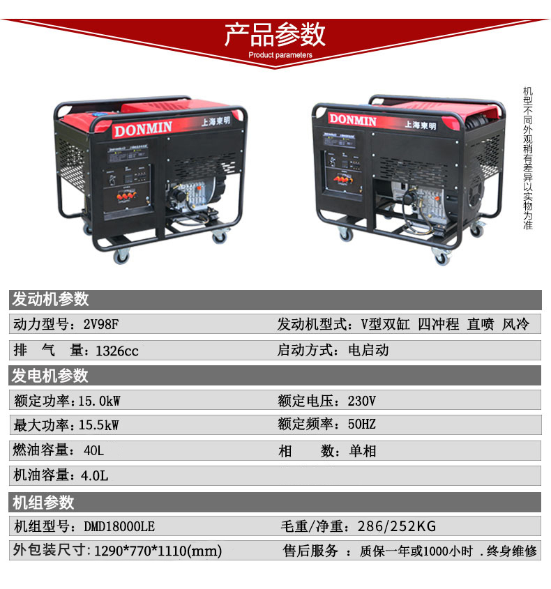 - 上海東明單相12KW 12000W柴油發(fā)電機(jī)組DMD15000LE ◆采用雙缸V型結(jié)構(gòu),動(dòng)力強(qiáng)勁; ◆大型消音器,動(dòng)平衡轉(zhuǎn)軸,低噪音機(jī)組設(shè)計(jì),采用具有減震功能的外殼與框架; ◆大容量油箱確保長時(shí)間的連續(xù)工作; ◆無熔絲斷路器提供過載保護(hù),電容電壓調(diào)節(jié)器,確保穩(wěn)定電壓輸出; ◆定向輪加萬向輪結(jié)構(gòu),移動(dòng)方便。